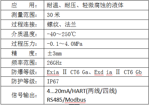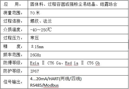 HHRD系列傳感器是26G高頻雷達式物位測量儀表,輸出4-20mA模擬信號,測量******距離可達70米。 天線被進一步優(yōu)化處理,新型的快速的微處理器可以進行更高速率的信號分析處理,使得儀表可以用于:反應(yīng)釜或固體料倉非常復(fù)雜的測量條件。