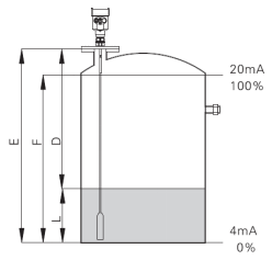 通過(guò)輸入空罐高度E(=零點(diǎn)),滿罐高度F(=滿量程)及一些應(yīng)用參數(shù)來(lái)設(shè)定,應(yīng)用參數(shù)將自動(dòng)使儀表適應(yīng)測(cè)量環(huán)境。對(duì)應(yīng)于4-20mA輸出。