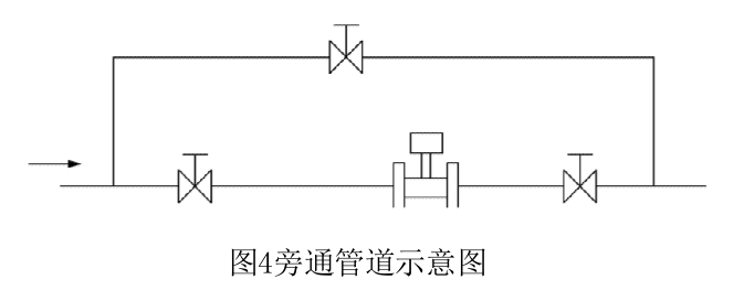 3)密封墊不能凸入管道內(nèi),其內(nèi)徑可比傳感器內(nèi)徑大1~2mm 4)如需斷流檢查與清洗傳感器,應設置旁通管道如圖4所示。