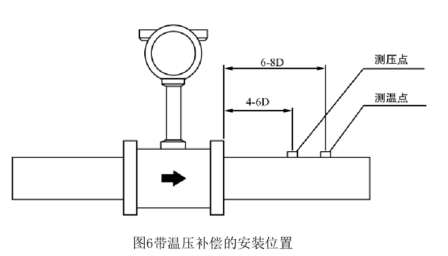 電氣安裝應注意傳感器與轉(zhuǎn)換器之前采用屏蔽電纜或低噪聲電纜連接,其距離不應 超過使用說明書的規(guī)定。布線時應遠離強功率電源線,盡量用單獨金屬套管保護。應遵 循“一點接地”原則,接地電阻應小于10Ω。整體型和分離型都應在傳感器側(cè)接地,轉(zhuǎn) 換器外殼接地點應與傳感器“同地”。帶溫壓補償時安裝位置,如圖6所示。