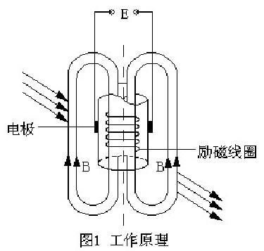 傳感器實(shí)際上是一種液體流速測(cè)量?jī)x表。它是應(yīng)用法拉第感應(yīng)定律的原理制成的流速測(cè)量?jī)x表。圖1 是插入型流量計(jì)基本工作原理的示意圖。用一個(gè)長(zhǎng)桿將一個(gè)小的電磁流量傳感器插入到被測(cè)量管道中規(guī)定的位置,導(dǎo)電流體垂直流過(guò)傳感器的工作磁場(chǎng)時(shí)(轉(zhuǎn)換器向傳感器提供勵(lì)磁電流時(shí),在勵(lì)磁線圈構(gòu)成的勵(lì)磁系統(tǒng)中便產(chǎn)生工作磁場(chǎng)),相當(dāng)于導(dǎo)體在磁場(chǎng)中作切割磁力線運(yùn)動(dòng)。根據(jù)法拉第感應(yīng)定律可知,在導(dǎo)體的兩端產(chǎn)生感應(yīng)電動(dòng)勢(shì)。此感應(yīng)電動(dòng)勢(shì)由接觸流體的一對(duì)電極來(lái)檢測(cè)。